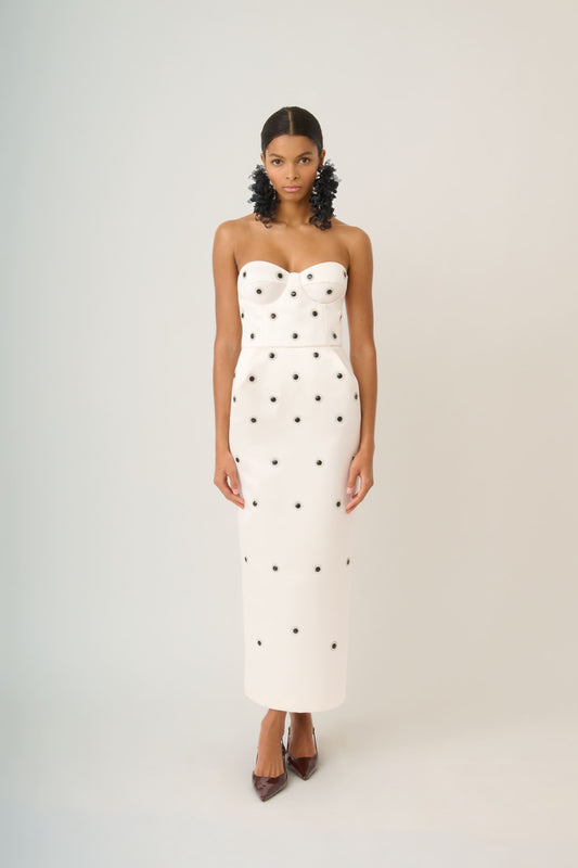 Vestido tubo bustier sin tirantes con cristales aplicados a mano