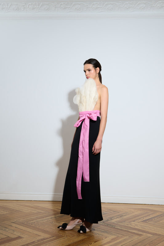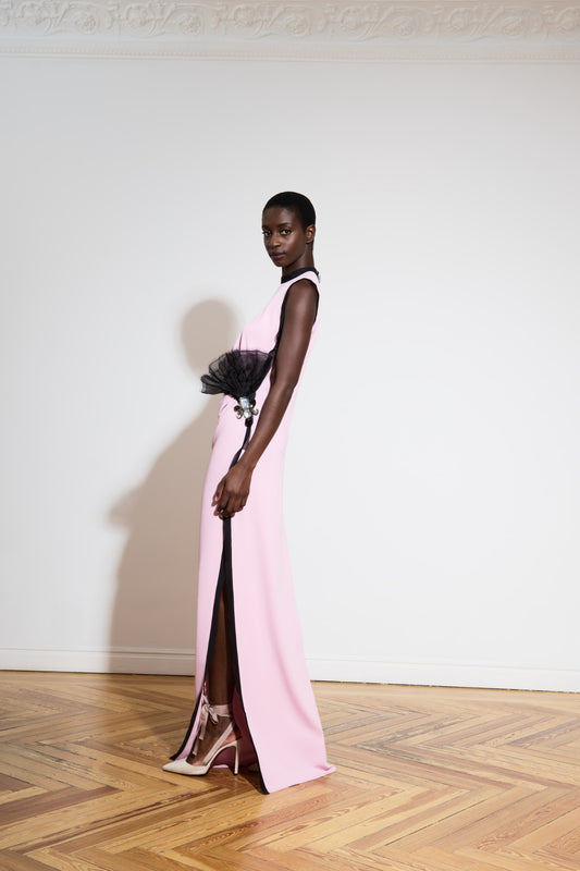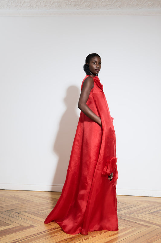 Vestido largo de organza con aplicaciones florales
