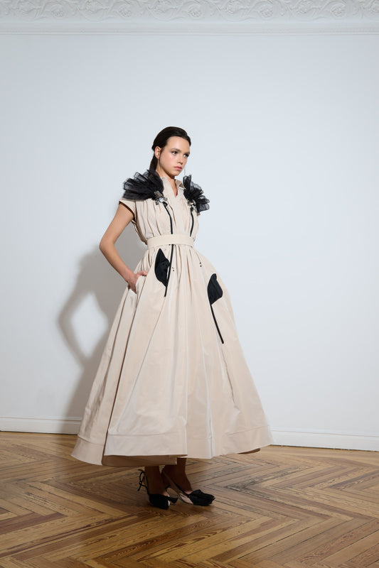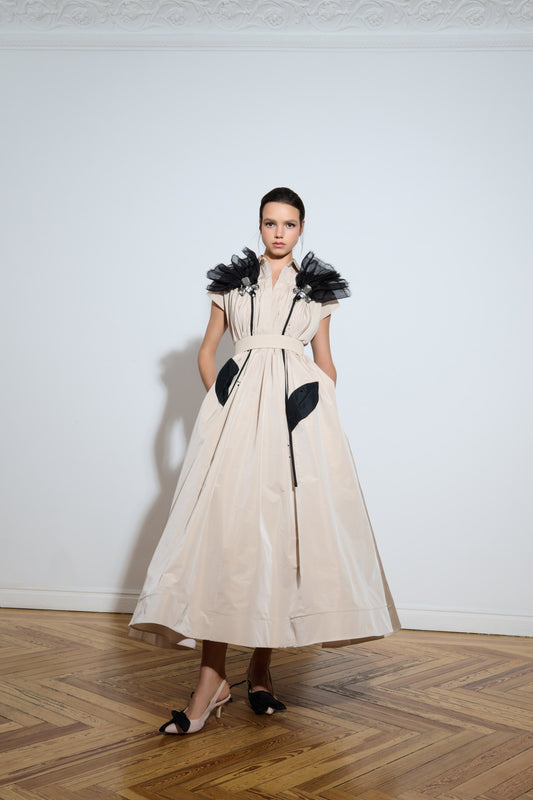 Vestido camisero midi de organza y tafetán con aplicaciones florales