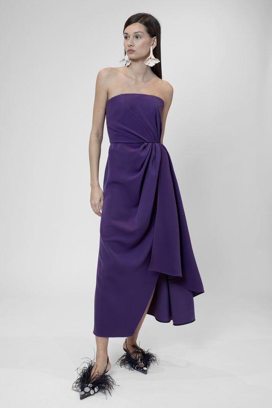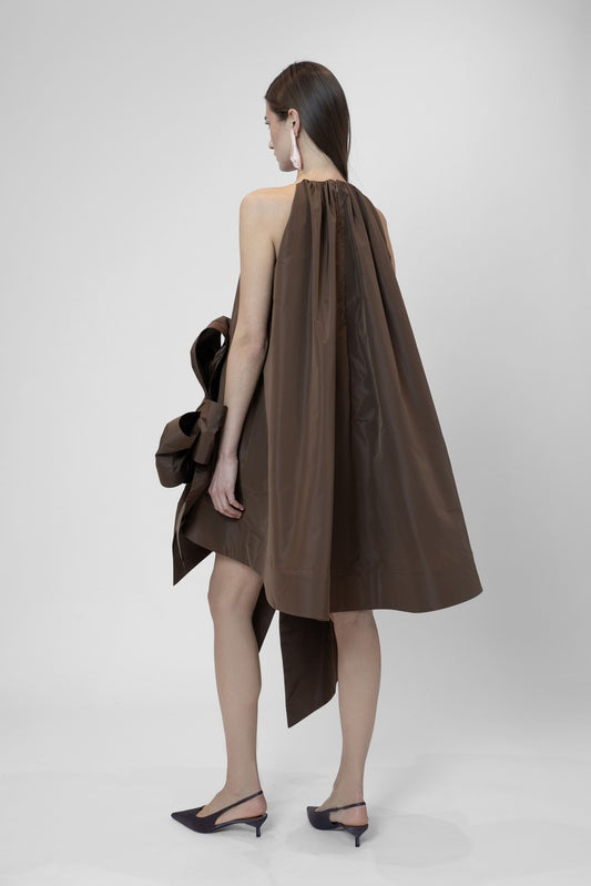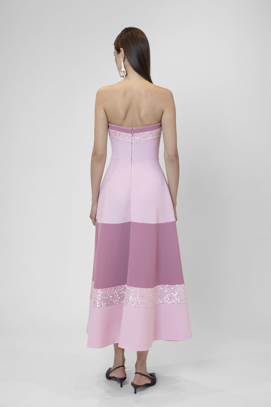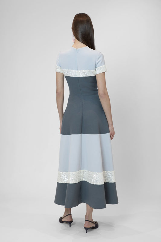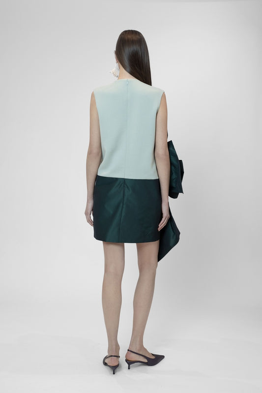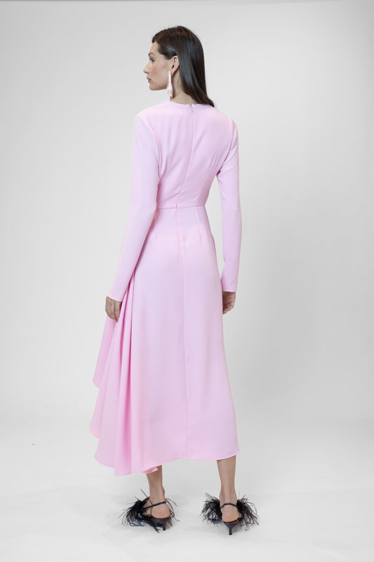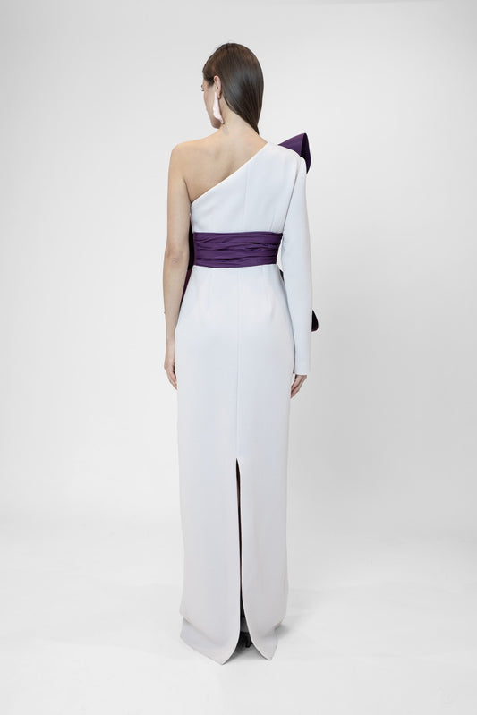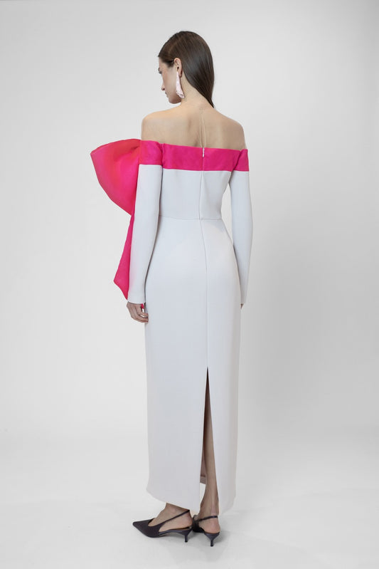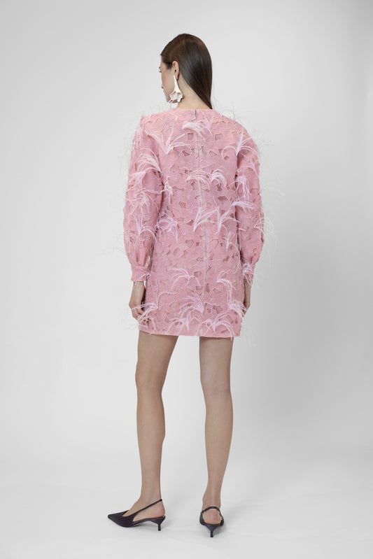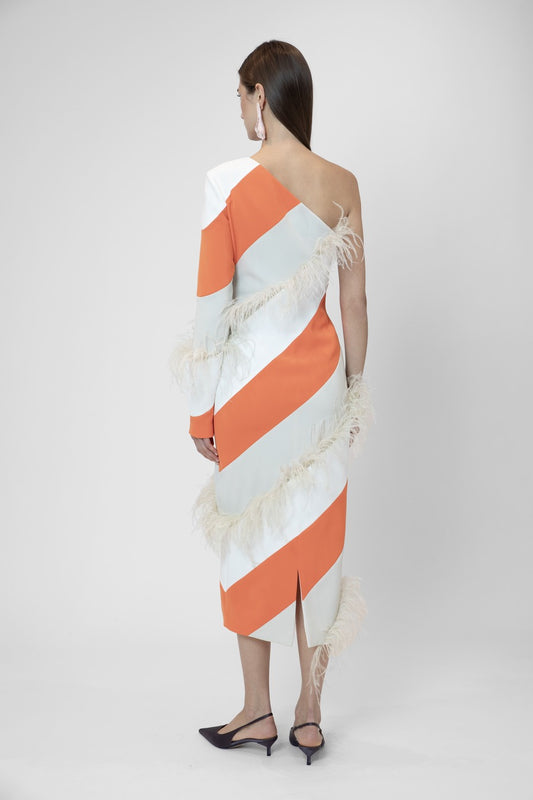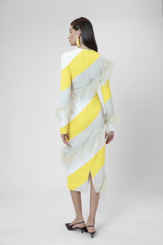 Vestido bicolor de manga larga con aplicaciones de plumas