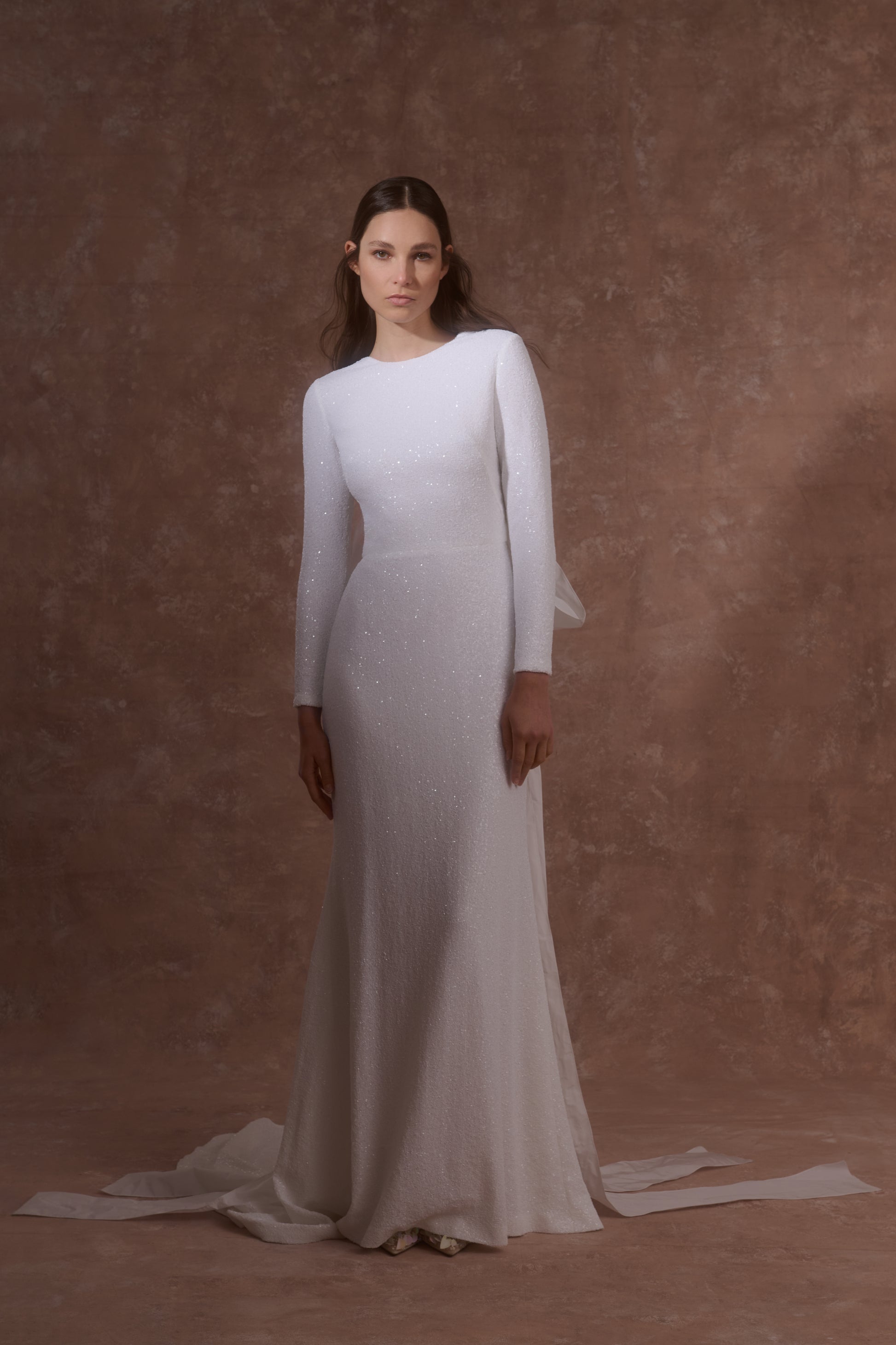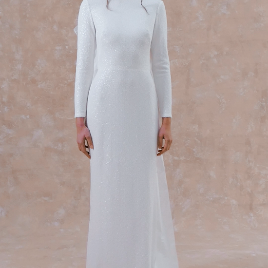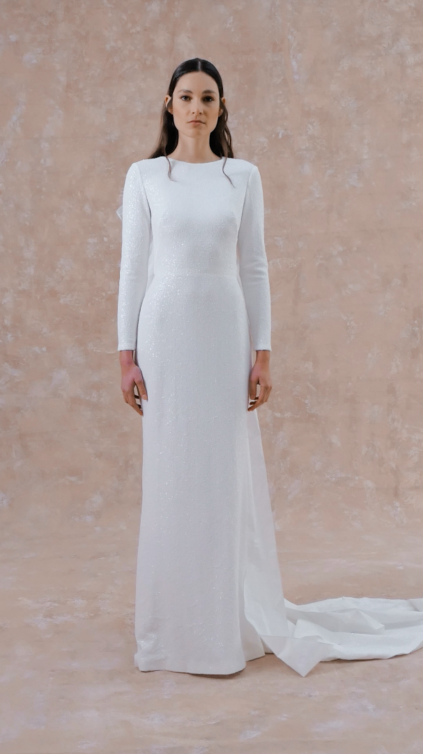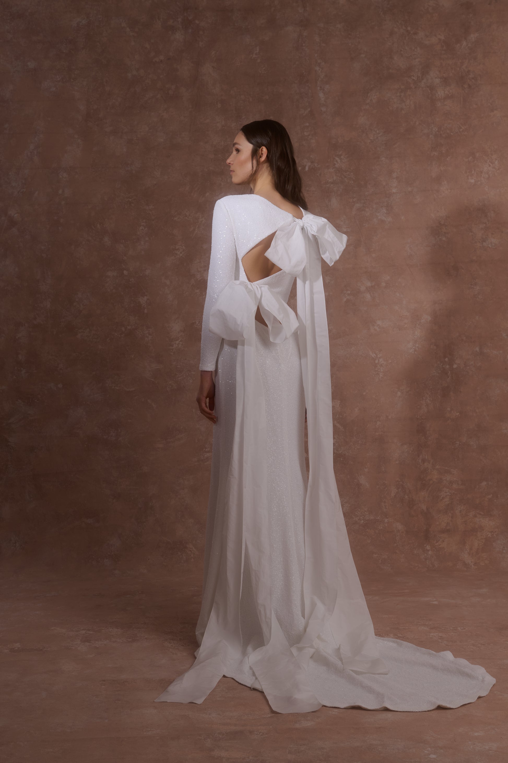 Dress made in micro-paillette fabric. Featuring a fitted silhouette, long sleeves, and a crew neckline and a subtle train. The dress features an asymmetric zig-zag neckline at the back, with a zipper closure and accented with taffeta bows.