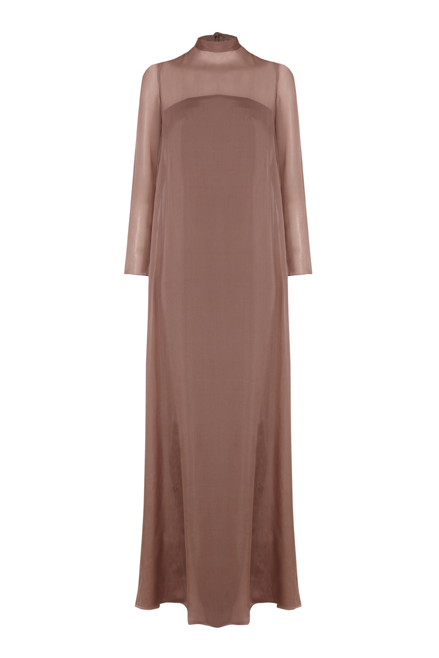This long silk dress features a high neckline and a back tie, crafted from delicate muslin. It comes with a long crepe inner dress in the same tone, offering a refined and sophisticated look.