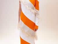 Discover the unique style of our midi dress with feathers and asymmetrical sleeves. Made in crepe, this dress features a stunning two-toned diagonal effect and hand-sewn feather appliques. Elevate your outfit with the perfect balance of elegance and modernity. Model is 1,80cm and wears size 38.