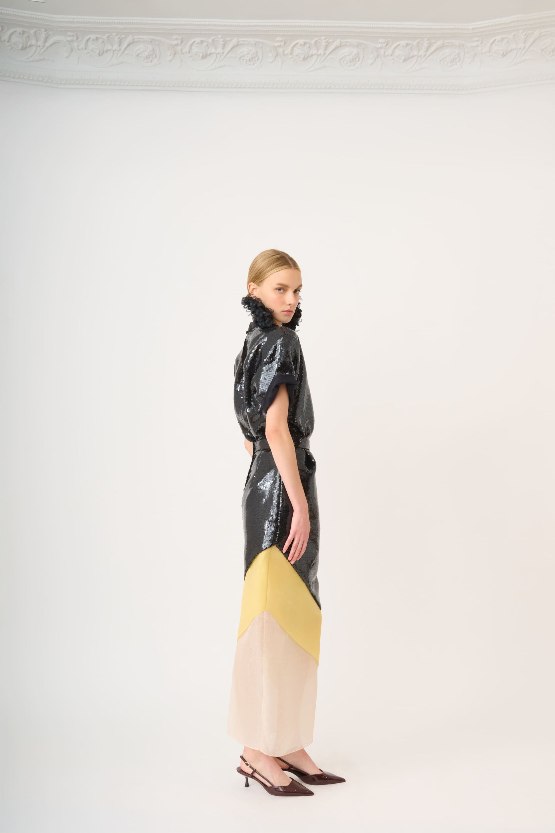 Midi pencil skirt featuring a fitted silhouette crafted in sparkling sequined fabric. The lower part is enhanced with two asymmetric organza layers in contrasting colors, adding depth, movement, and a modern interplay of textures.