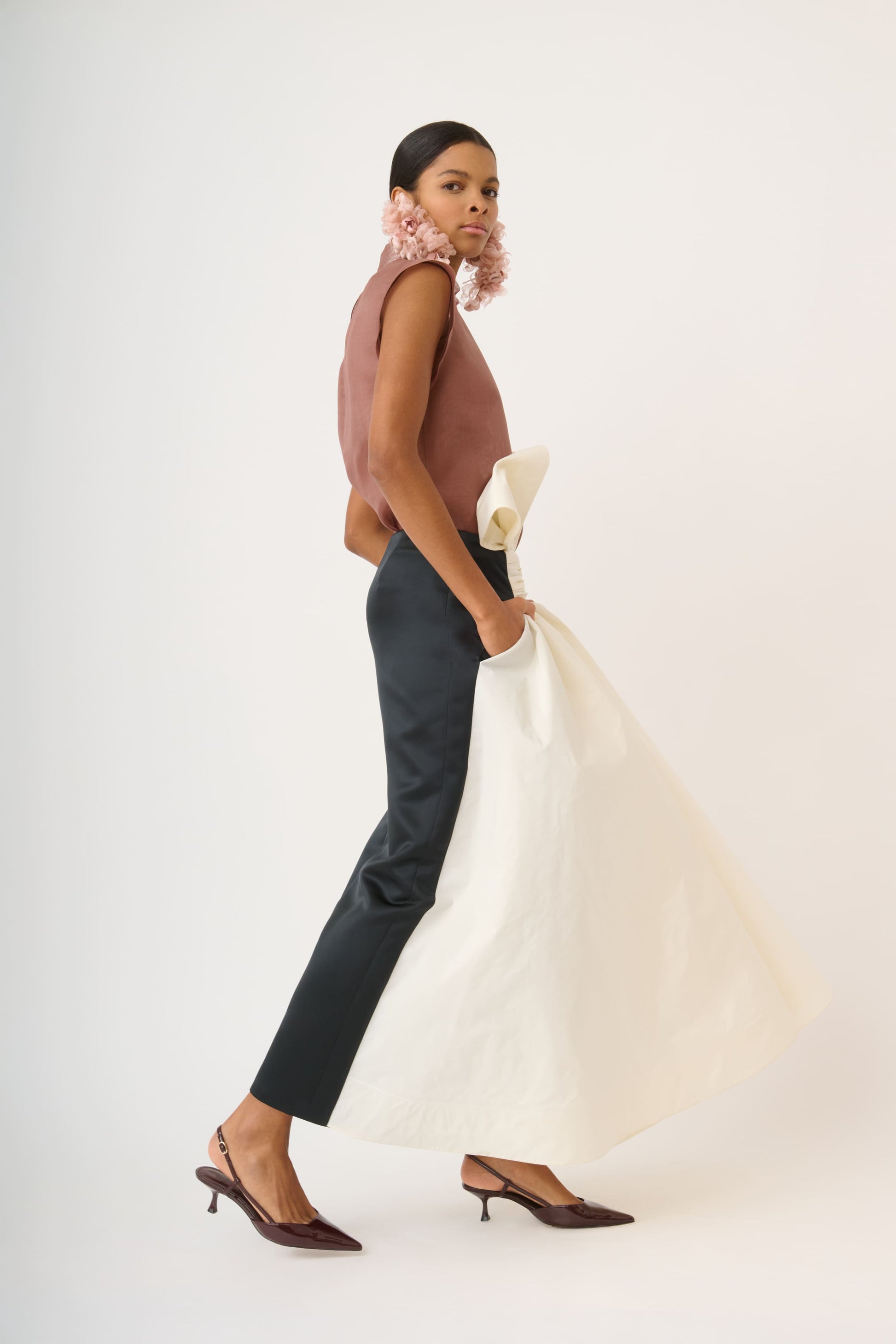 Midi skirt crafted in a combination of structured taffeta at the front and contrasting satin at the back. The front features bow-shaped detailing that opens into layered panels, creating movement, volume, and a playful yet sophisticated silhouette.