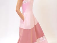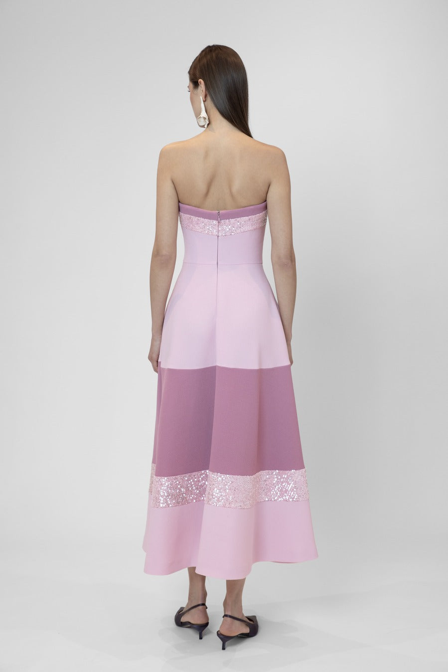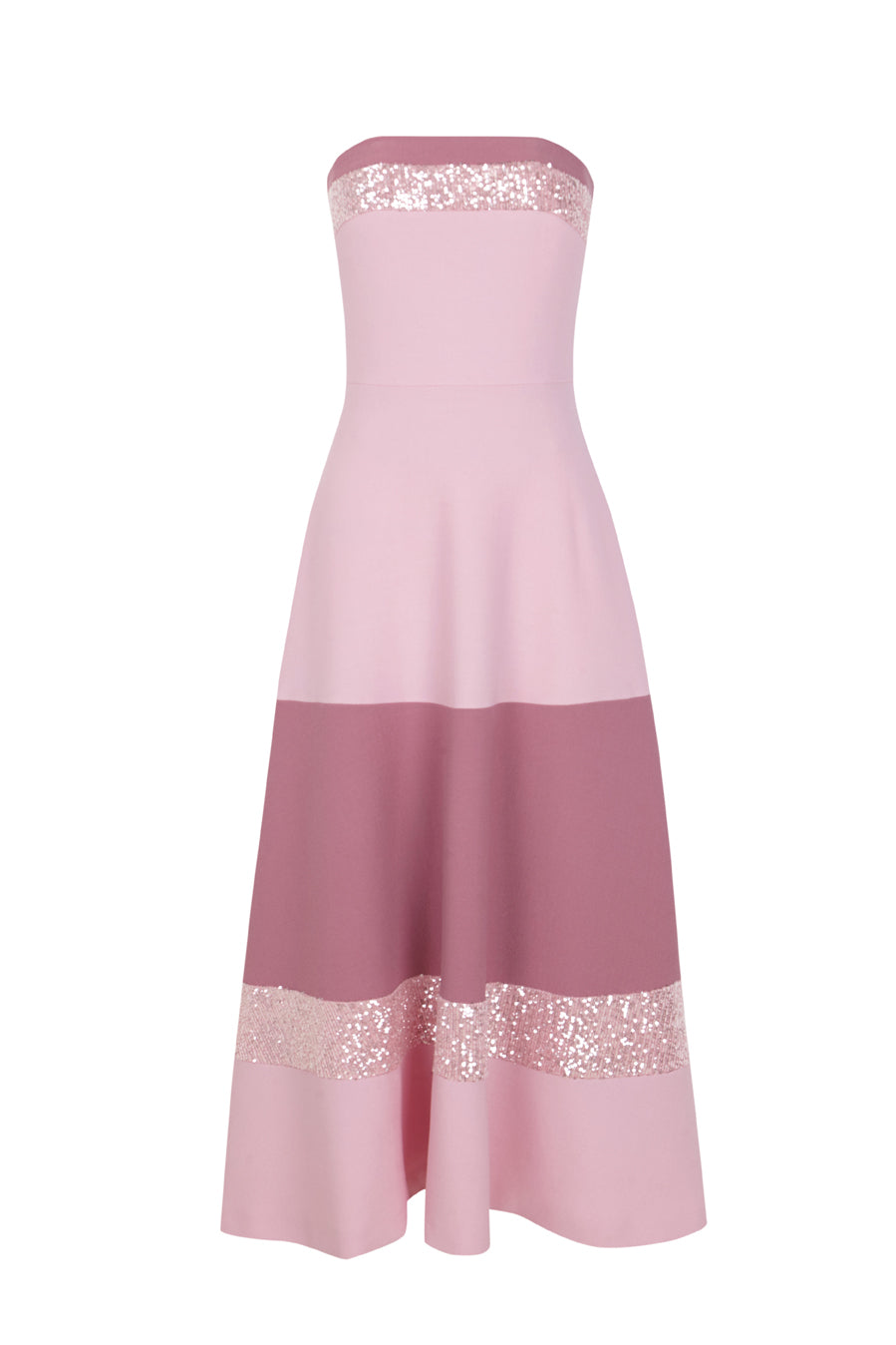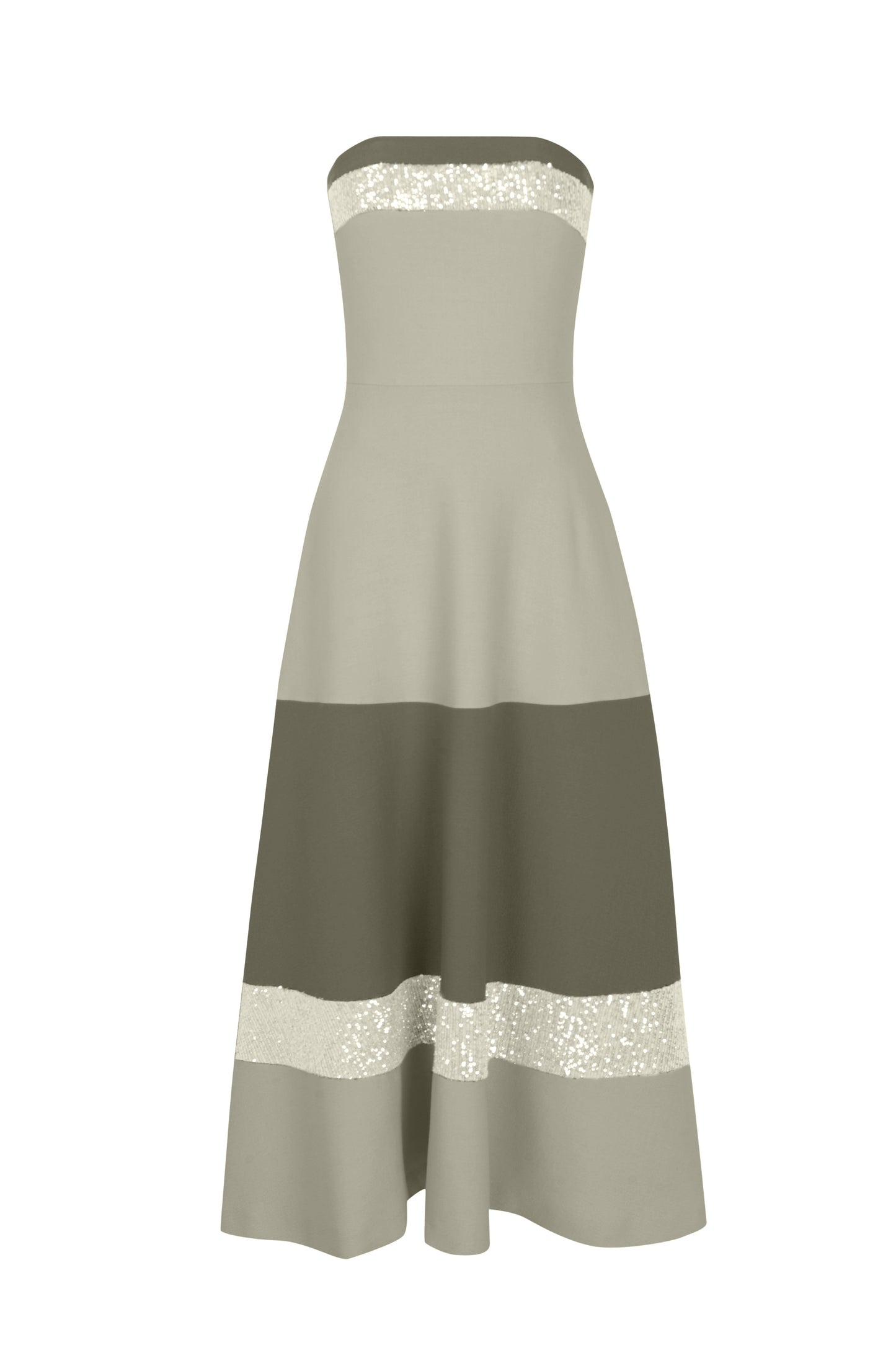 Midi Strapless Dress, made with two-toned wool crepe and a sequin band for a touch of elegance. With an inner corse for added support and a flattering silhouette, this dress is perfect for any formal occasion. Elevate your style with our paillette detail. Model is 1,80cm and wears size 38.