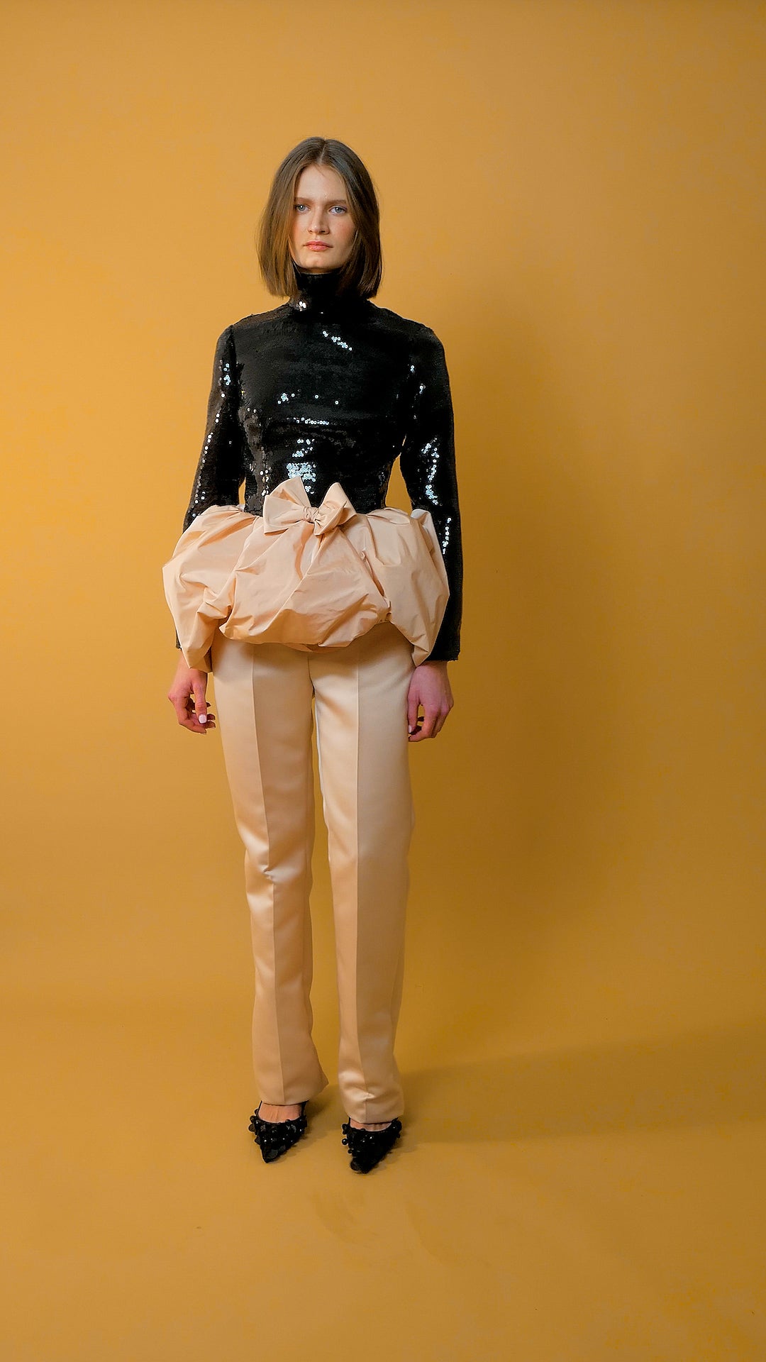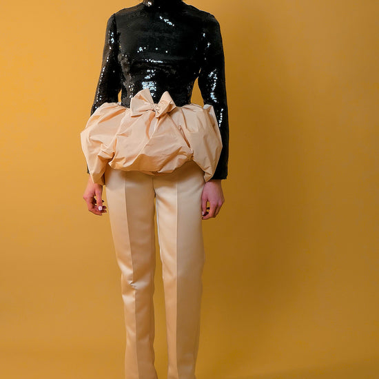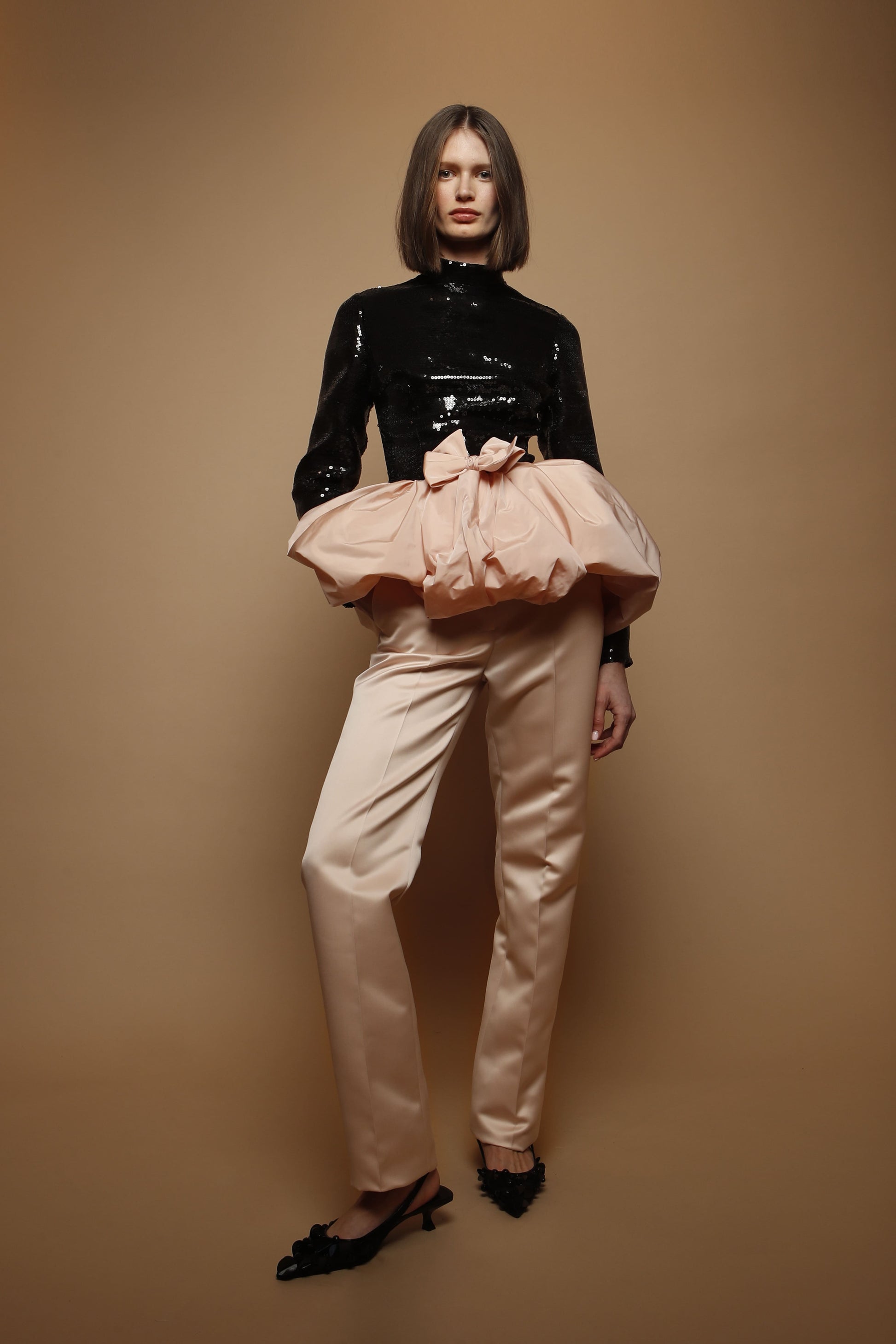 Satin long pants, with a straight cut. It has a front zipper closure and a hook at the waist.