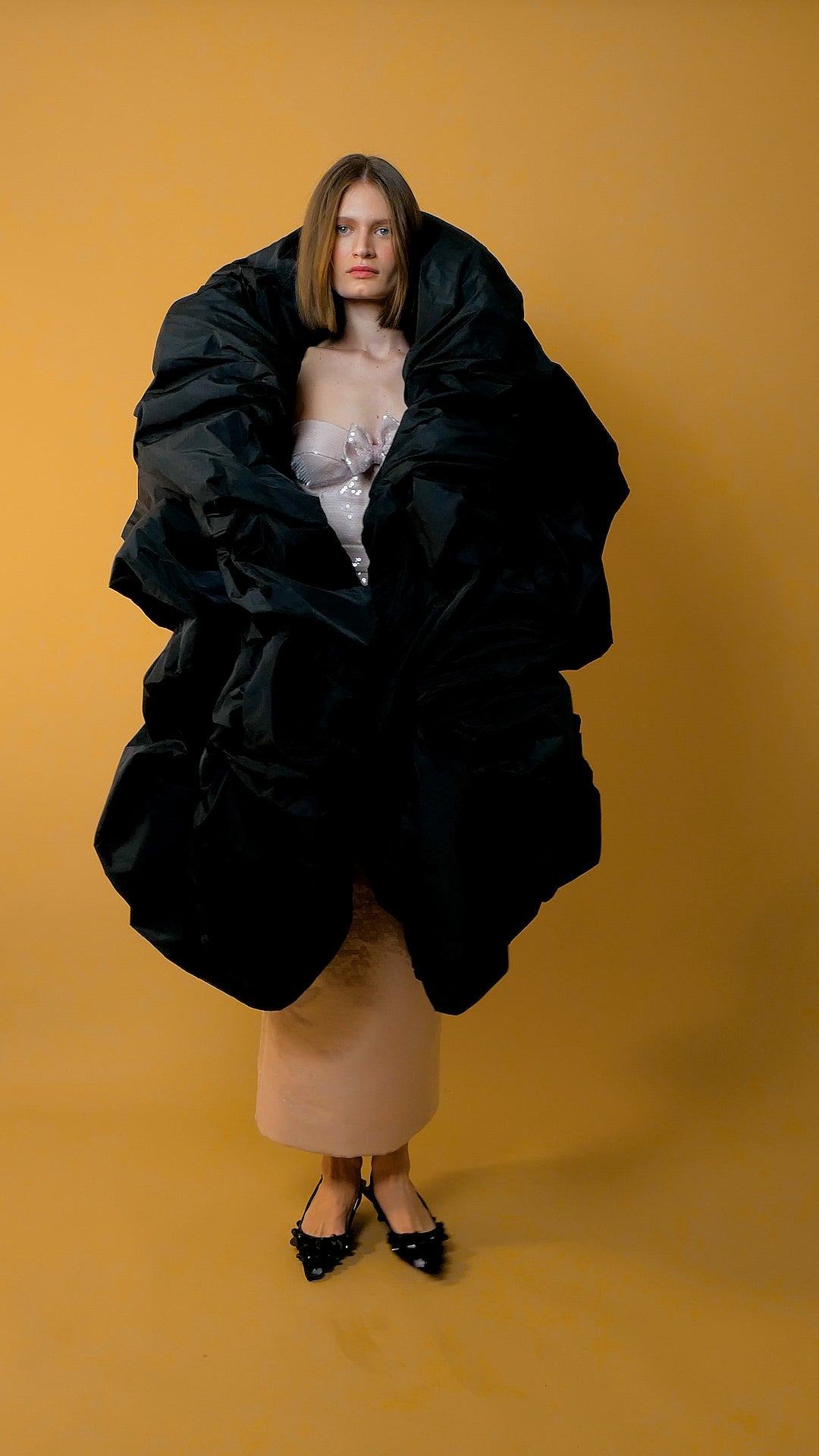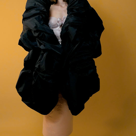 Maxi abrigo de taffeta con volumen por el relleno de tul, que crea ese efecto de volantes enormes en toda la chaqueta.