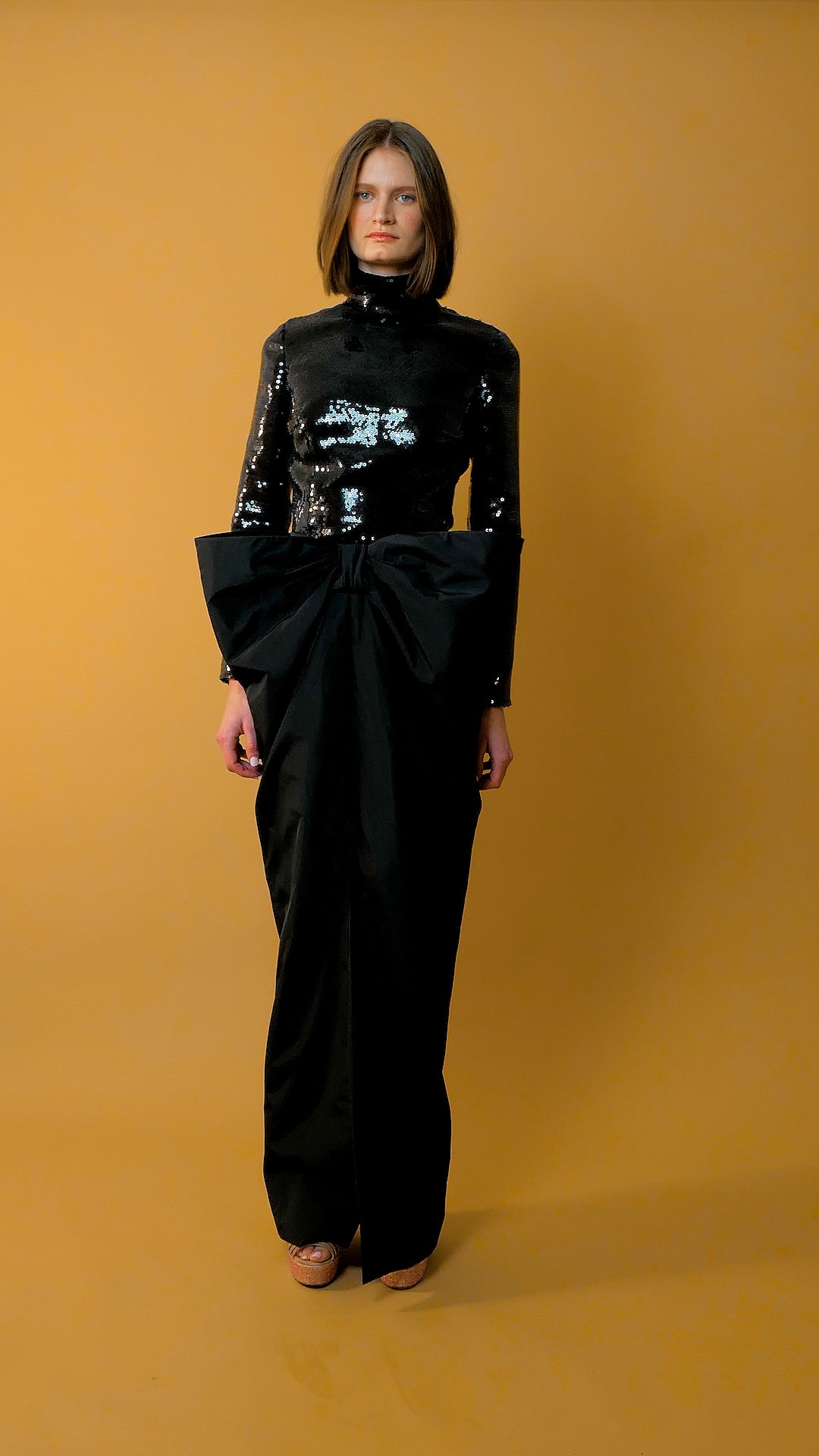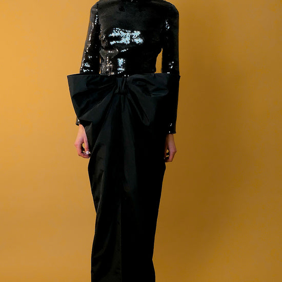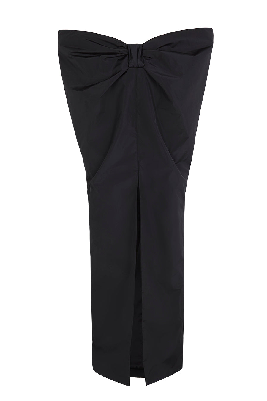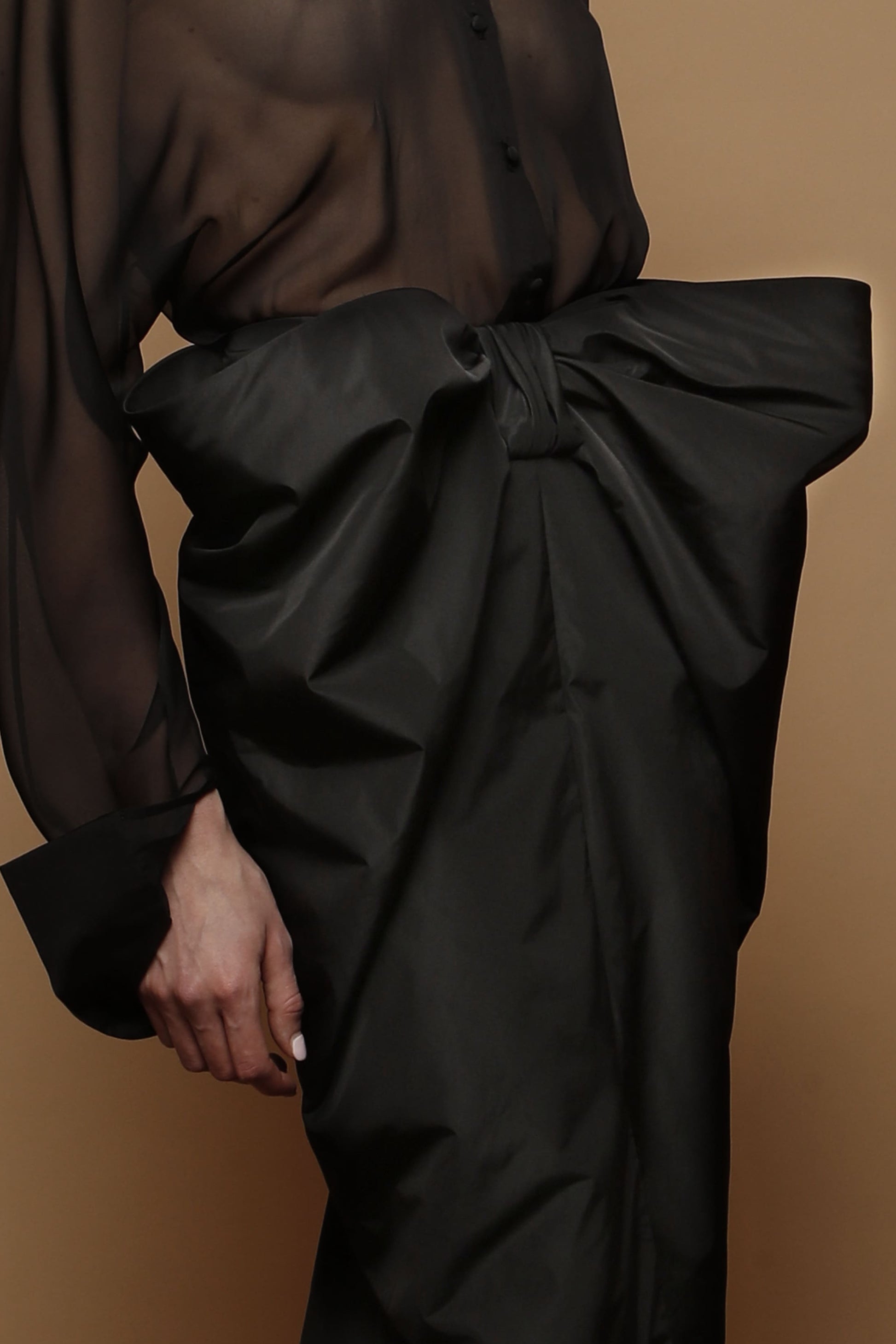 Falda larga de taffeta, con volumen en la cadera creando un maxi lazo, y con abertura delantera.