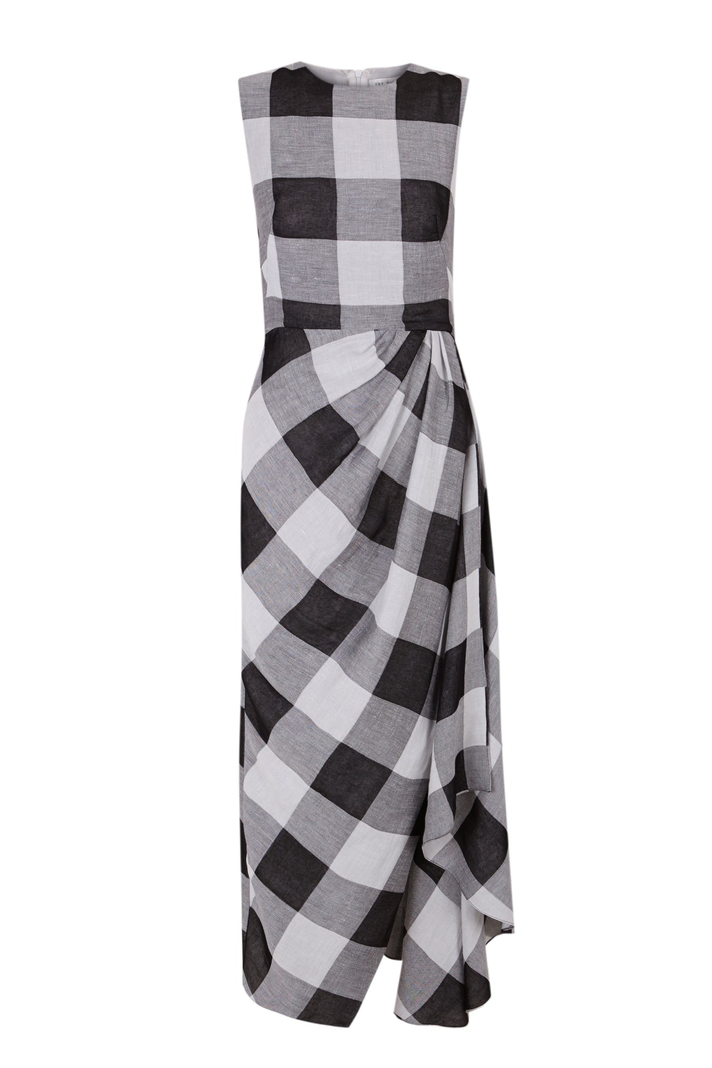 Vestido largo sin mangas con estampado Gingham. Escote redondo, corte en la cintura y pliegue lateral en la falda. También disponible en estampado Vichy.