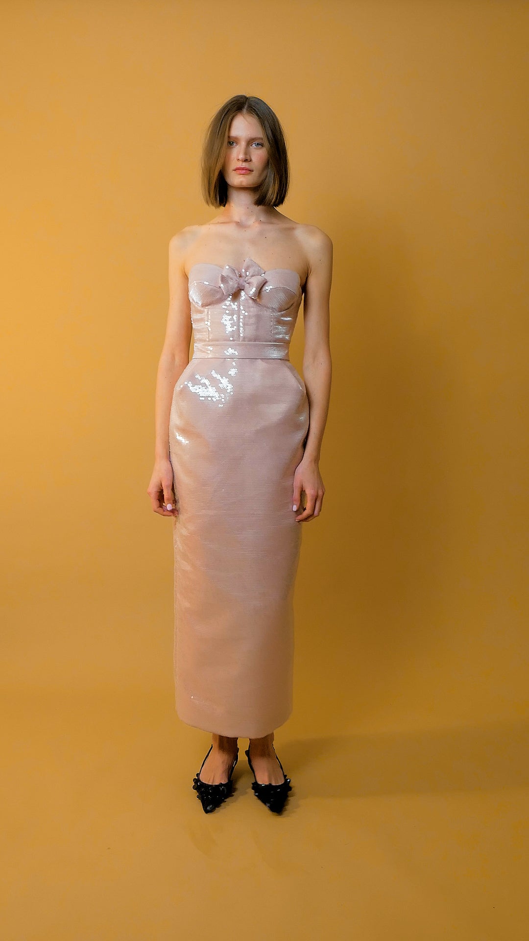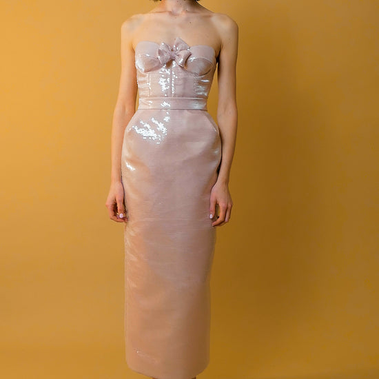 Top de paillettes palabra de honor, encorsetado, con aro en el pecho y un lazo en medio. Cuenta con cierre de cremallera en la espalda.