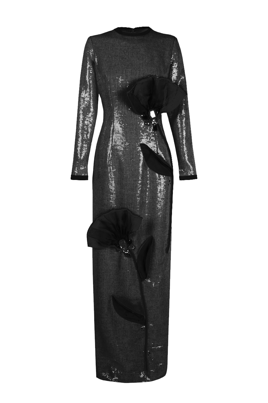 Vestido de lino adornado con apliques florales hechos a mano en tafetán y organza, y  con cristales brillantes. La silueta ceñida se realza con ribetes en negro en los puños y el cuello. Perfecto para cualquier ocasión elegante.