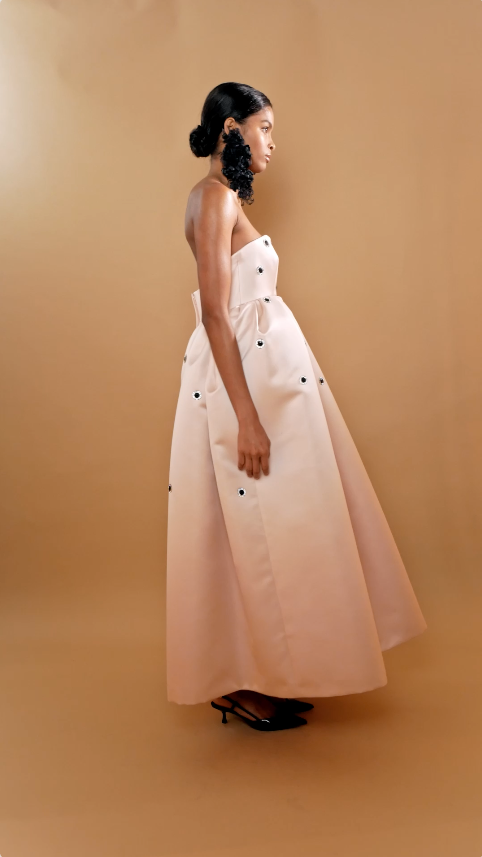 Vestido midi de satén sin tirantes con cintura fruncida que crea un sutil volumen en la falda. Está adornado con cristales aplicados a mano e incluye discretos bolsillos laterales para mayor practicidad. Confeccionado en satén suave, este vestido combina elegancia, sastrería moderna y sofisticación natural.
