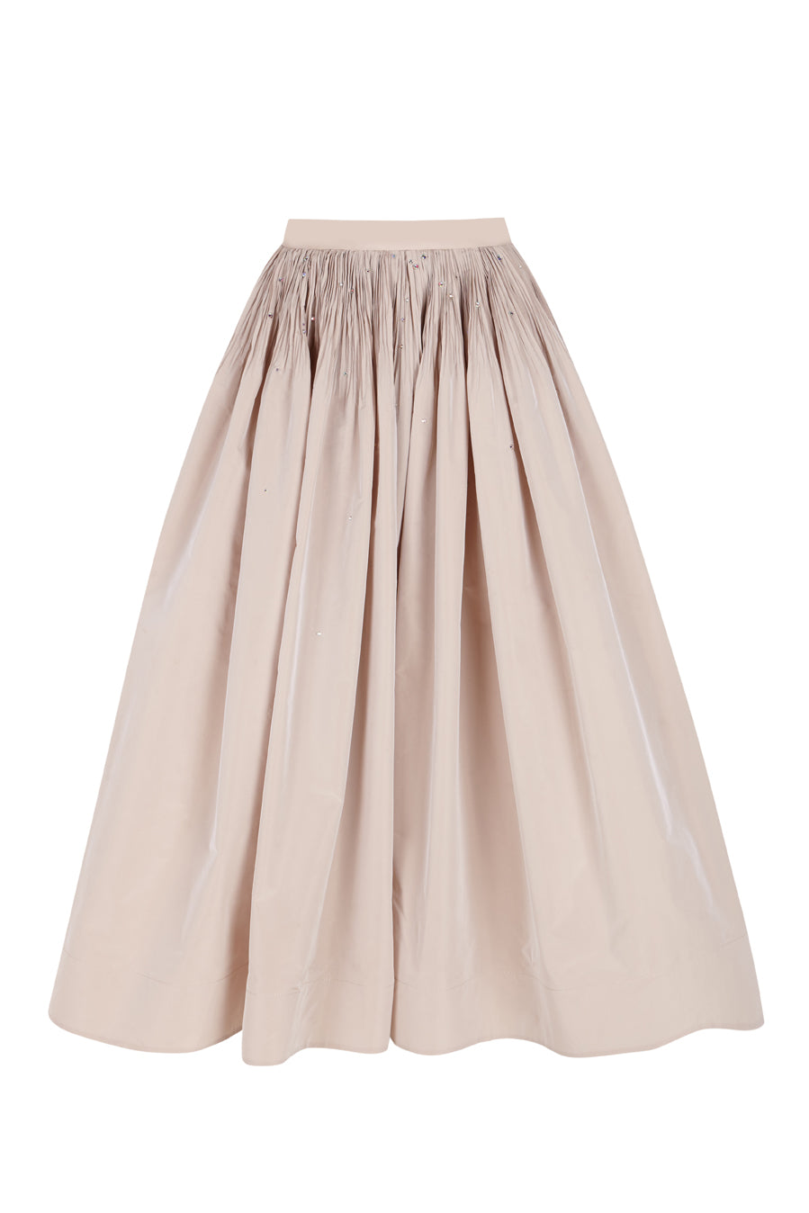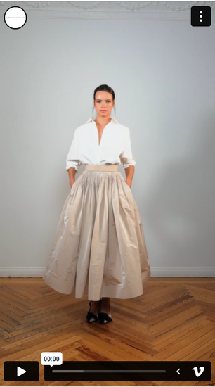 Este conjunto presenta una falda midi plisada a mano en el taller, combinada con una camisa blanca básica. La falda cuenta con apliques de cristal, que añaden un detalle distintivo. La camisa, hecha de algodón 100% y con manga murciélago, aporta un toque contemporáneo y elegante.