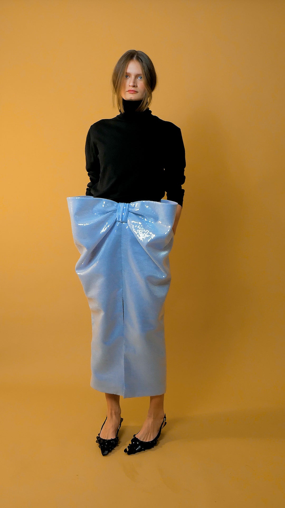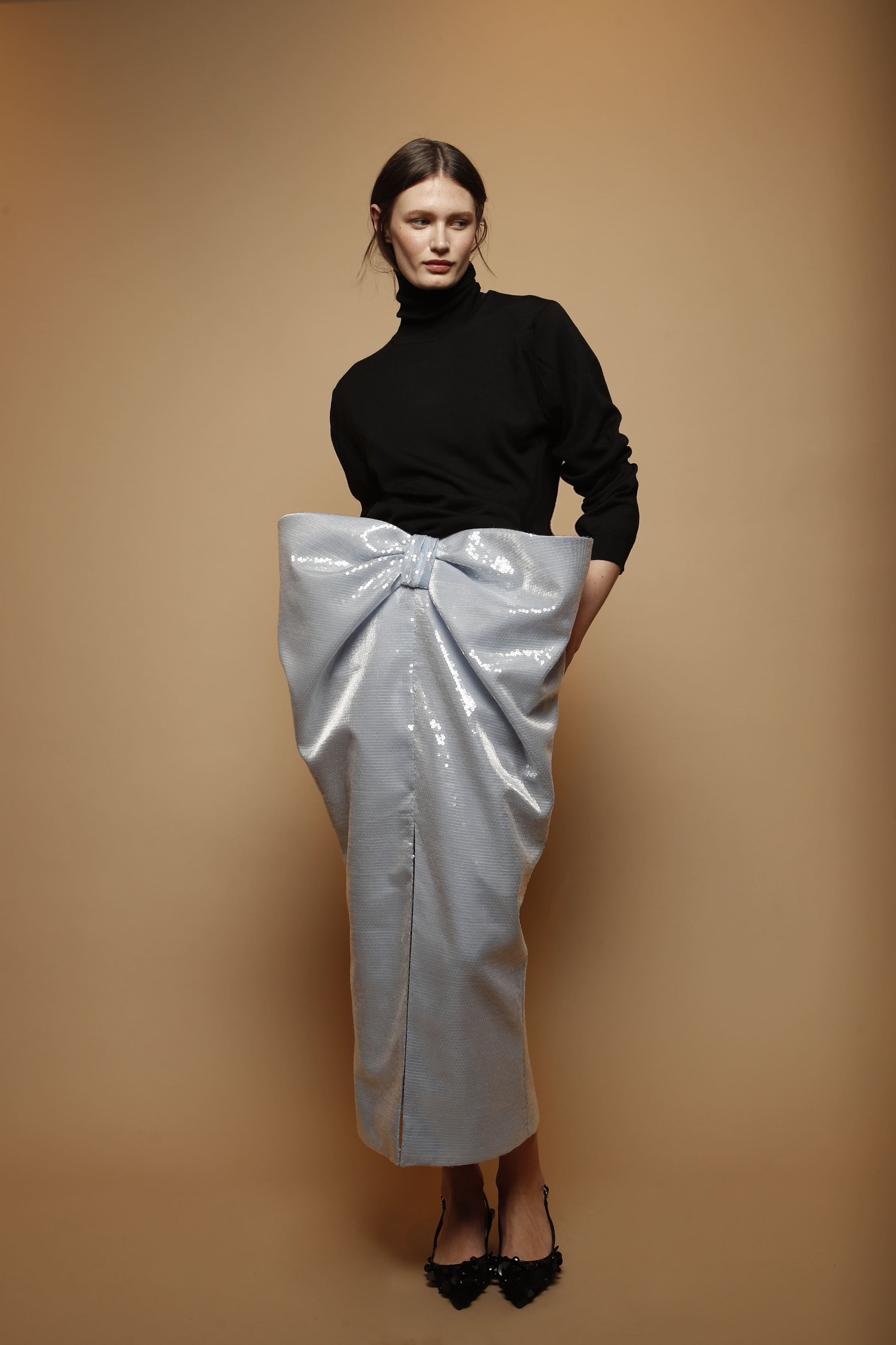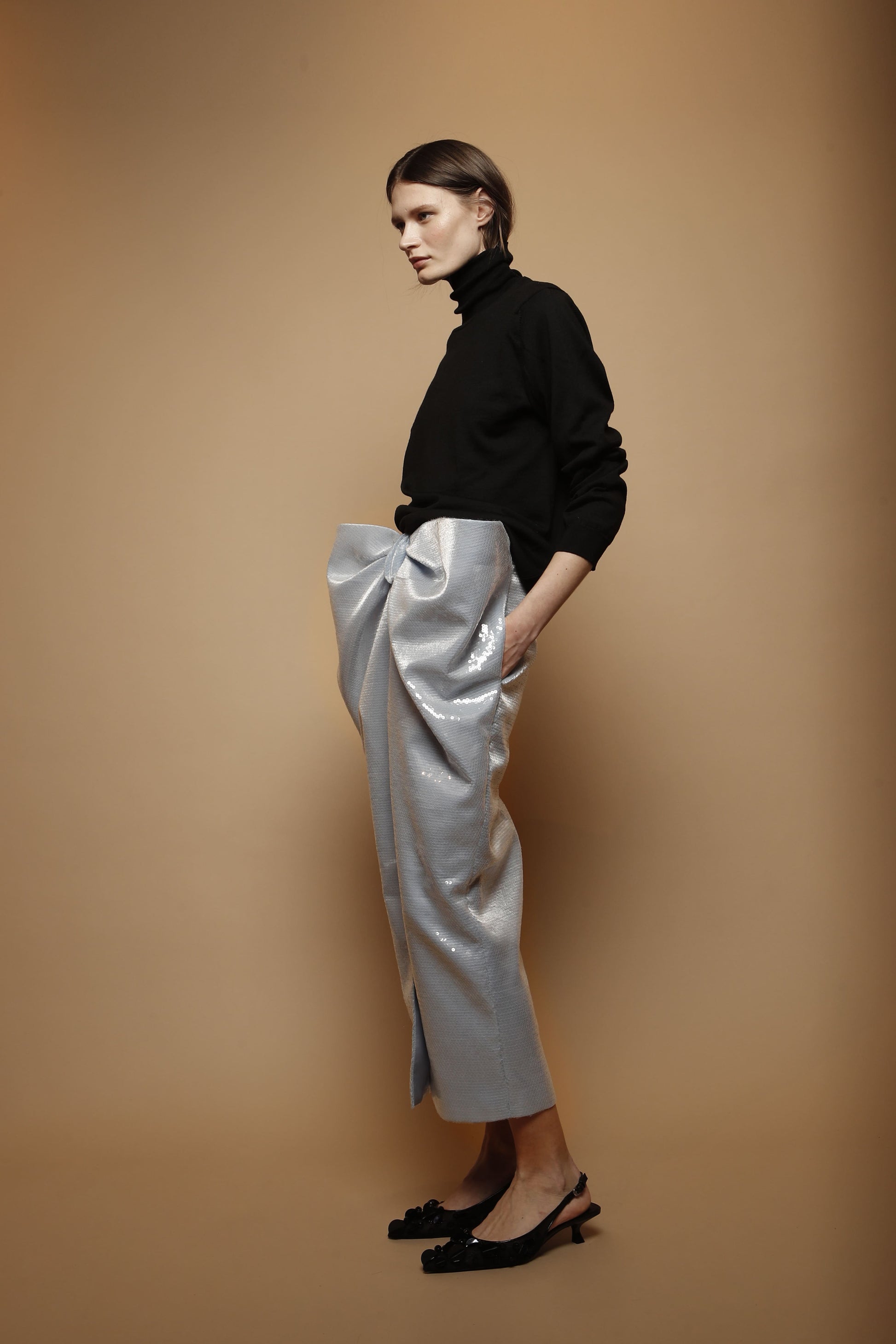 Falda midi de paillettes, con volumen en la cadera creando un maxi lazo, y con abertura delantera.
