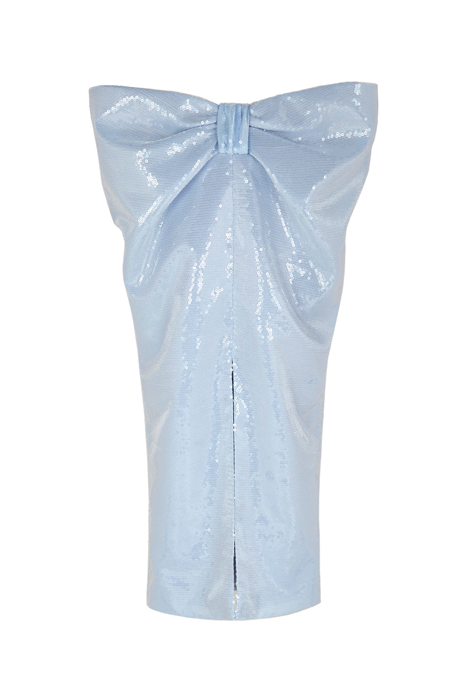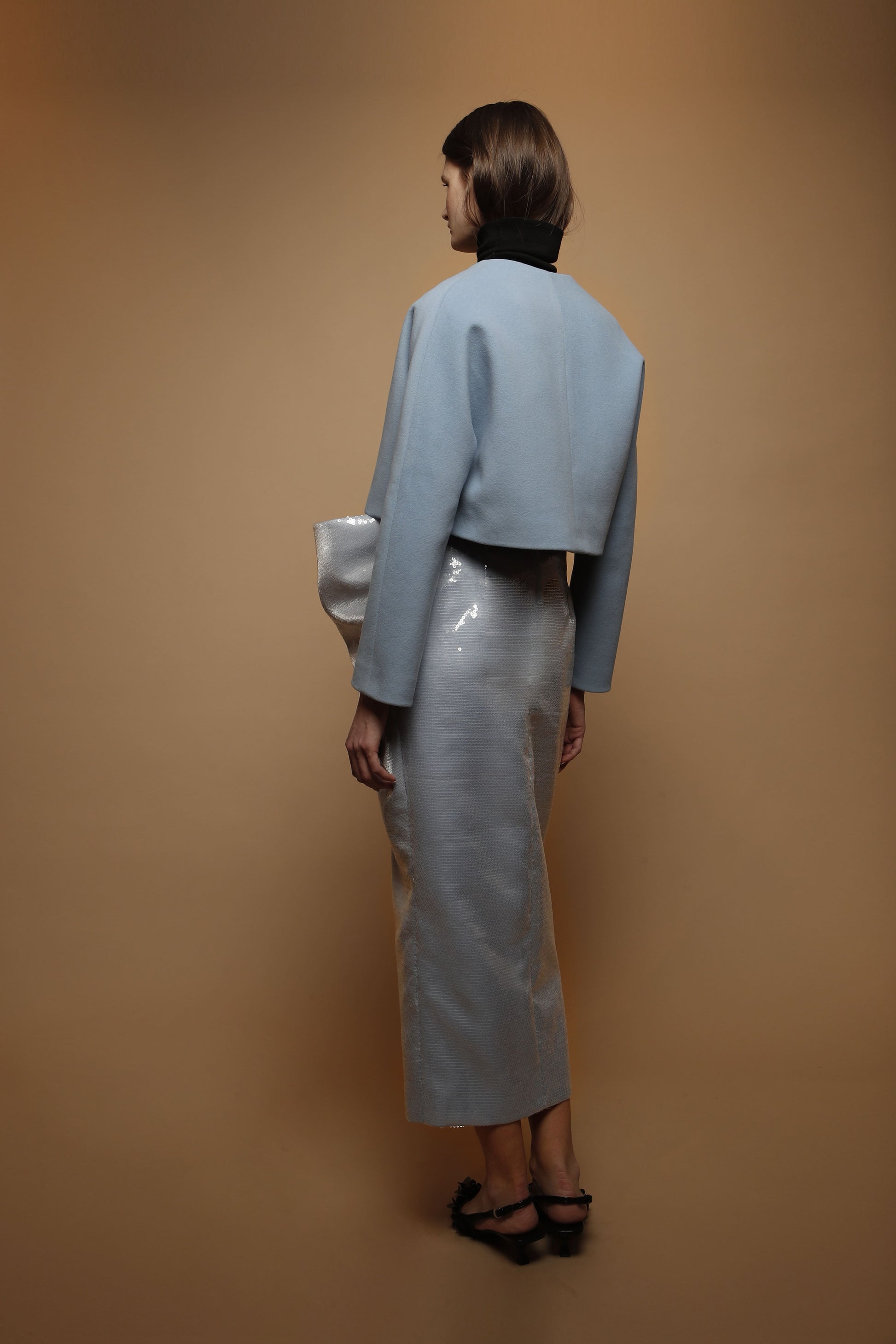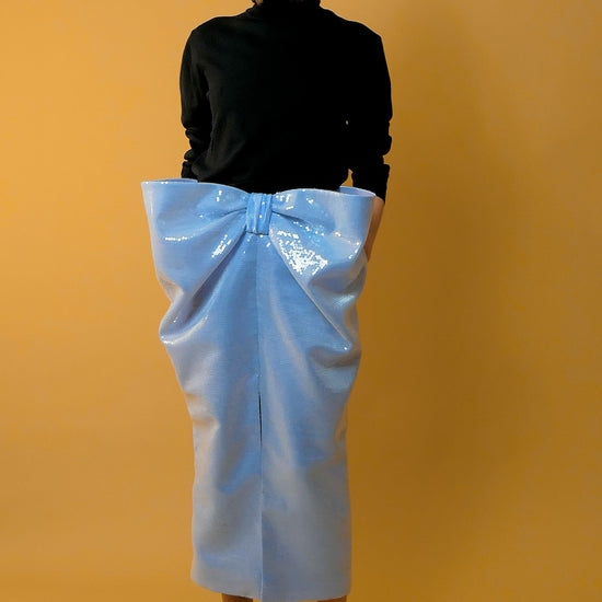 Falda midi de paillettes, con volumen en la cadera creando un maxi lazo, y con abertura delantera.