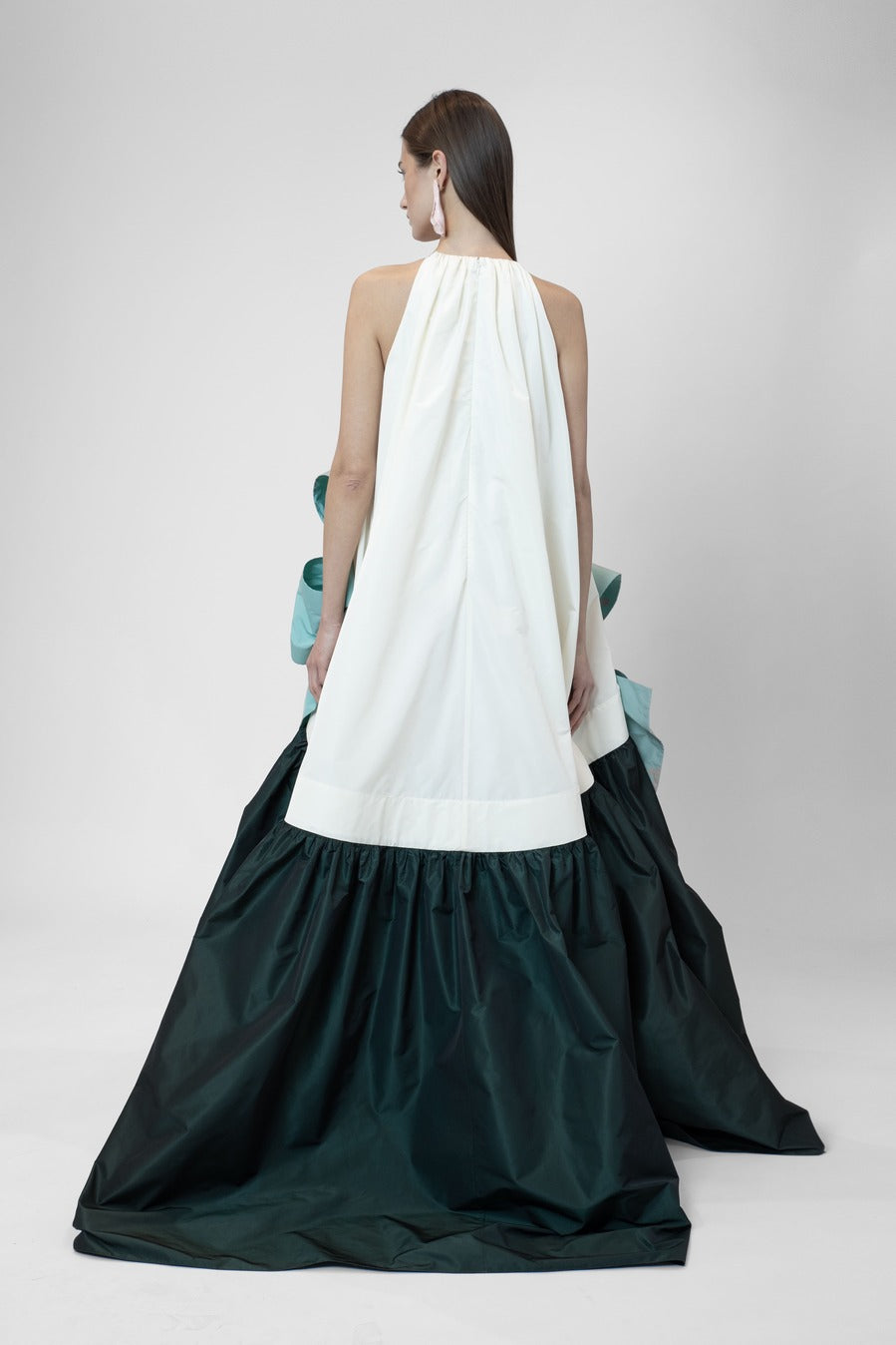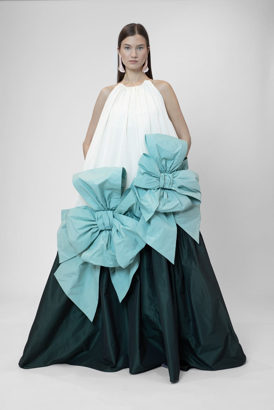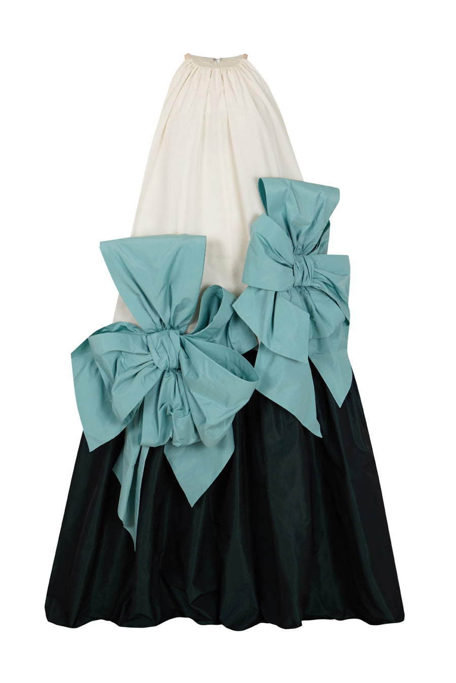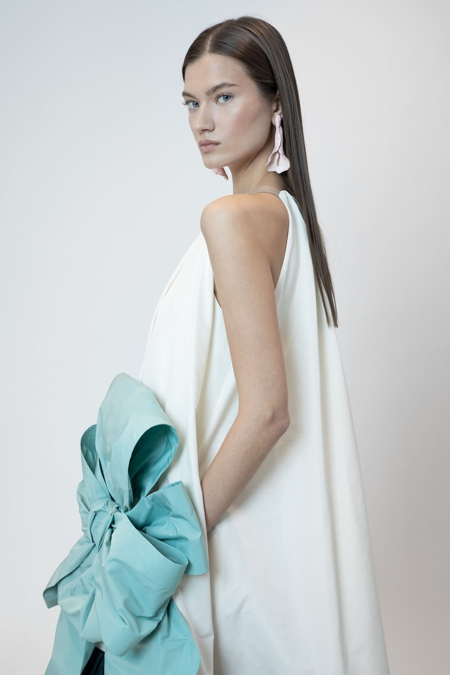 Nuestro maxi vestido de tafetán sin mangas, presenta un diseño tricolor. La silueta en forma de A ofrece una silueta con volumen a la vez que favorecedora, mientras que los grandes lazos largos en la misma tela agregan un toque elegante y alegre. Eleva tu estilo con este vestido llamativo. La modelo mide 1,80 cm y usa talla 38.